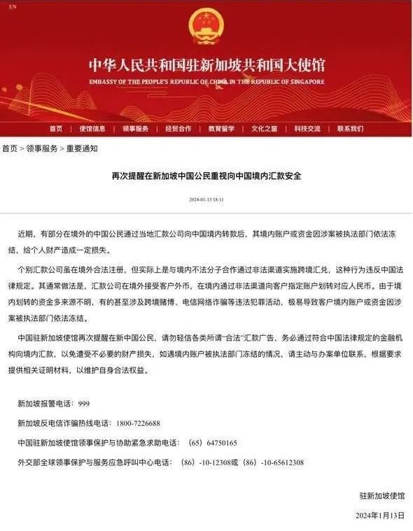 此前中國(guó)駐新加坡大(dà)使館也一再發文,提醒關于彙款安全的注意事(shì)項。