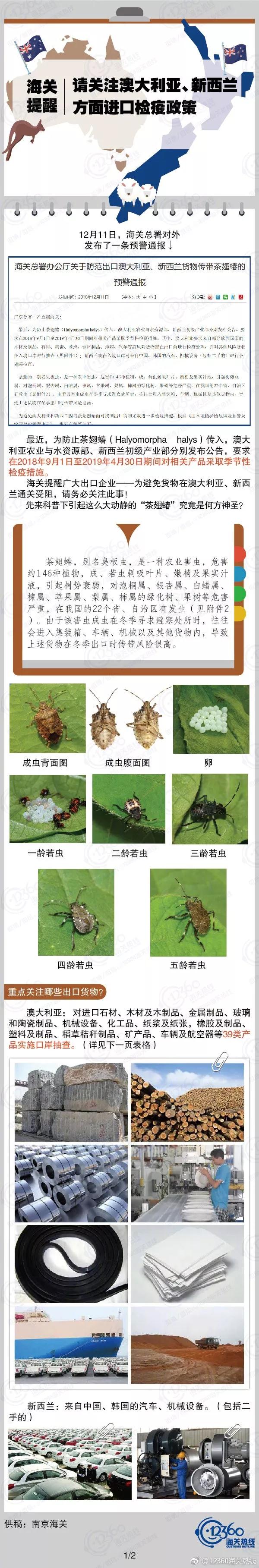 最近,爲防止茶翅蝽傳入,澳大(dà)利亞農業與水資源部、新西蘭初級産業部分(fēn)别發布公告,要求在2018年(nián)9月1日(rì)至2019年(nián)4月30日(rì)期間對相(xiàng)關産品采取季節性檢疫措施。請(qǐng)相(xiàng)關出口企業或朋友們關注并互相(xiàng)轉告!