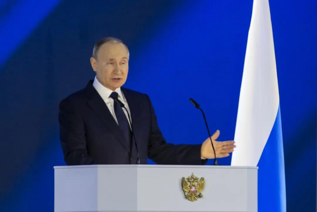 ▲ Russian President Vladimir Putin gives his annual State of the Nation Address at the Manezh Exhibition Center in Moscow, Russia, on Wednesday. Photo by Ren Qi/China Daily