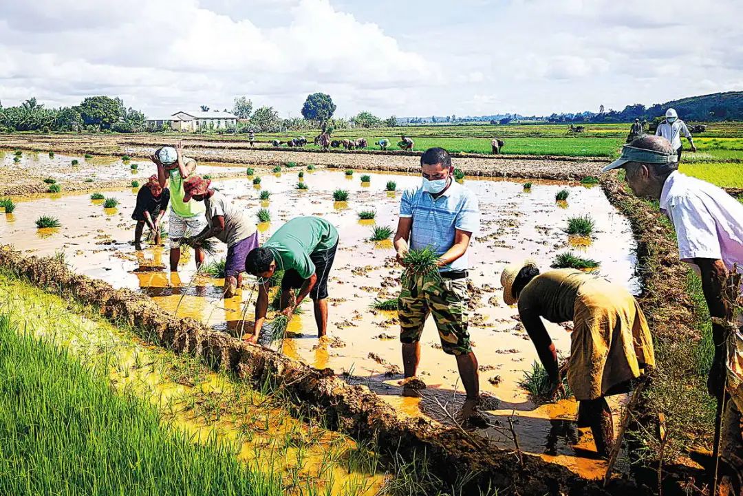 ▲ Chinese expert Yang Yaoxi (center) plants rice seedlings with farmers in Madagascar in January last year. Photo/China Daily