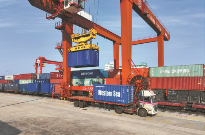 ▲ Containers are transferred at the China-Kazakhstan International Logistics Base in Lianyungang, Jiangsu province, on Nov 25, 2022. [Photo by Wang Jianmin/For chinadaily.com.cn]