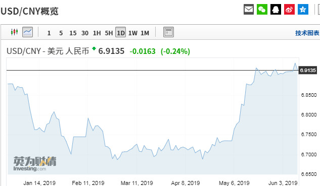 北京時間6月7日(rì)周五10點40左右,離(lí)岸人(rén)民(mín)币對美元彙率顯著走低,随後跌幅擴大(dà)、一度出現短(duǎn)線急貶,連續跌破6.94、6.95關口。至16點左右,觸及6.9624,創2018年(nián)11月以來(lái)新低,日(rì)内跌近400點,跌幅至少爲5月31日(rì)以來(lái)最大(dà)。不過短(duǎn)暫走低後,當日(rì)晚間離(lí)岸人(rén)民(mín)币彙率收複了這一關口。6月8日(rì)4點59分(fēn),離(lí)岸人(rén)民(mín)币兌美元報6.9435元。