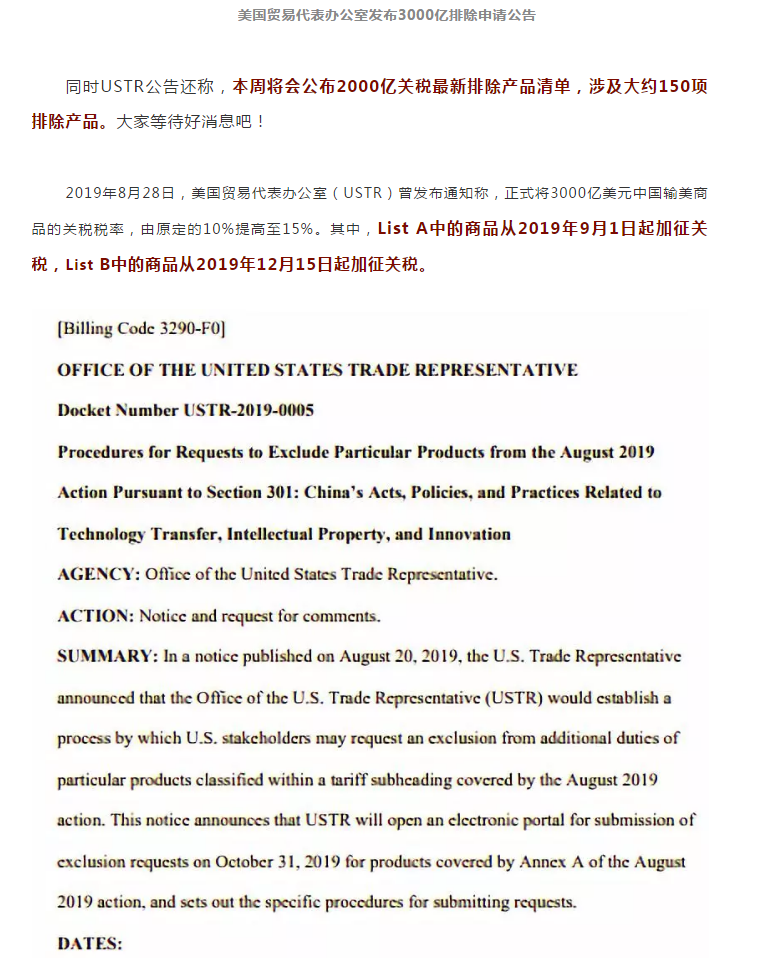 美國(guó)啓動對中國(guó)3000億美元征稅清單産品啓動排除程序