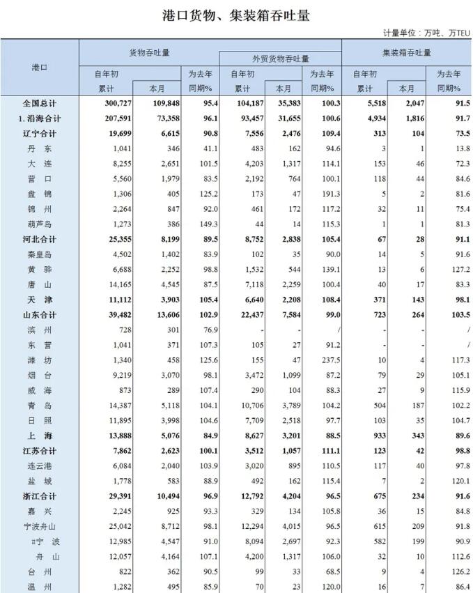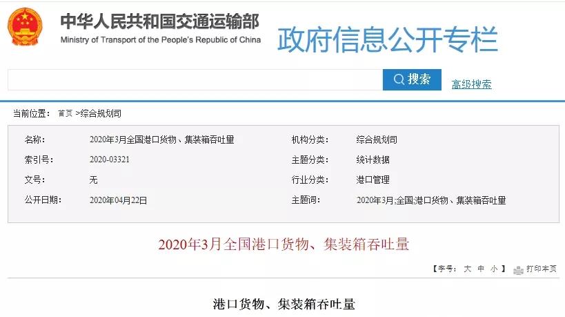 22日(rì),交通運輸部發布2020年(nián)3月及今三個月全國(guó)各大(dà)港口貨物、集裝箱吞吐量情況。一季度,全國(guó)港口貨物吞吐量同比下跌4.6%;外貿貨物吞吐量同比增長0.3%;集裝箱吞吐量5,518萬TEU,同比下跌8.5%。