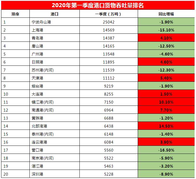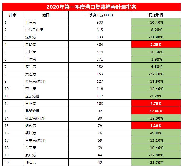 由于受新冠疫情的影(yǐng)響,貨物和集裝箱吞吐量均受不同程度影(yǐng)響。集裝箱吞吐量排名前十的港口,隻有青島港達到同比2.2%增幅,完成504萬TEU箱量;其他(tā)港口出現不同程度下滑,多數港口達兩位數跌幅,大(dà)連港跌幅更是達到27.7%。值得(de)一提的是,排名第13的北部灣港則出現了高達32.6%的增幅。全國(guó)港口集裝箱吞吐量前20排名如(rú)下表: