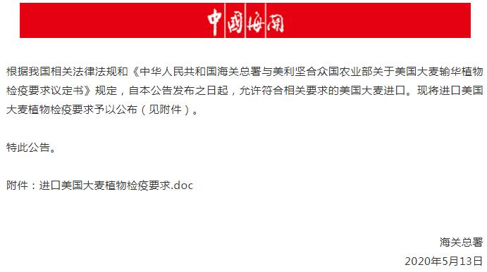 (三)《中華人(rén)民(mín)共和國(guó)海關總署與美利堅合衆國(guó)農業部關于美國(guó)大(dà)麥輸華植物檢疫要求議(yì)定書(shū)》。
