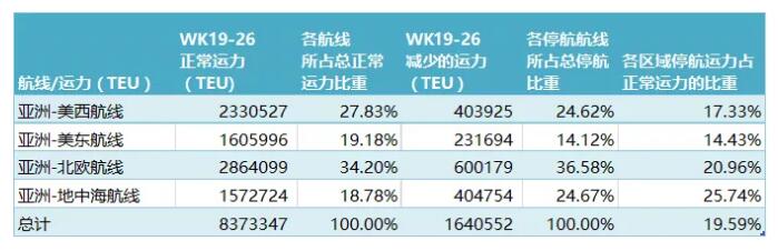 第19到26周,停航導緻的運力減少比重約爲19.6%。從(cóng)正常運力情況來(lái)看(kàn),各船(chuán)公司在亞洲-北歐航線投入的運力最多,其次是美西航線。同時北歐航線停航比重在四個航次中也是最高的,其次是地中海航線。