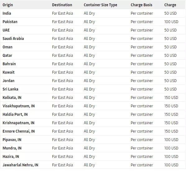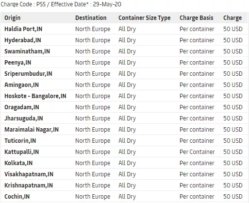從(cóng)2020年(nián)5月29日(rì)起,對從(cóng)印度南(nán)部和東部所有港口,到歐洲北部和南(nán)部國(guó)家的所有幹集裝箱貨物征收旺季附加費(PSS)