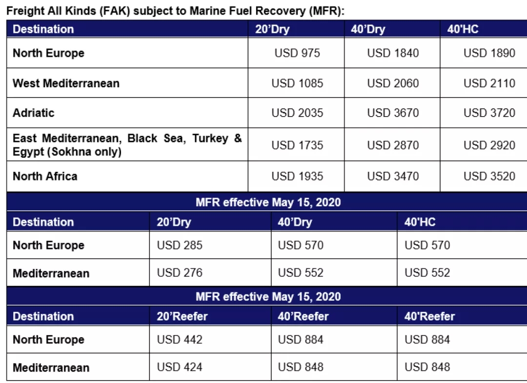 東亞到北歐和地中海FAK費率調整:自(zì)2020年(nián)6月1日(rì)起生(shēng)效,直至另行通知爲止,東亞(包括日(rì)本)的Hapag-Lloyd海運費率如(rú)下: