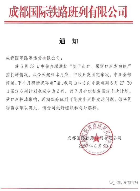 時間剛好過去(qù)一個星期,據悉,中歐班列、中亞班列的發運情況并沒有好轉。6月30日(rì),成都(dōu)國(guó)際鐵路(lù)班列有限公司再發通知,通知中稱鑒于山(shān)口、果斯口岸方向的嚴重擁堵情況,從(cóng)即日(rì)起到7月底,中歐隻發圖定車次,中亞全部停裝。何時恢複正常發運,下個月視情況再定。其實在6月27-30日(rì)期間,山(shān)口方向中歐班列,圖定的6列計(jì)劃已經減少爲2列,而且7月份也僅批複圖定車次計(jì)劃。該公司再次聲明受到口岸擁堵的直接影(yǐng)響,近期部分(fēn)班列可(kě)能發生(shēng)延期發運問(wèn)題、部分(fēn)貨物的物流需求難以及時滿足,請(qǐng)相(xiàng)關部門(mén)人(rén)士做好組織和對外解釋。