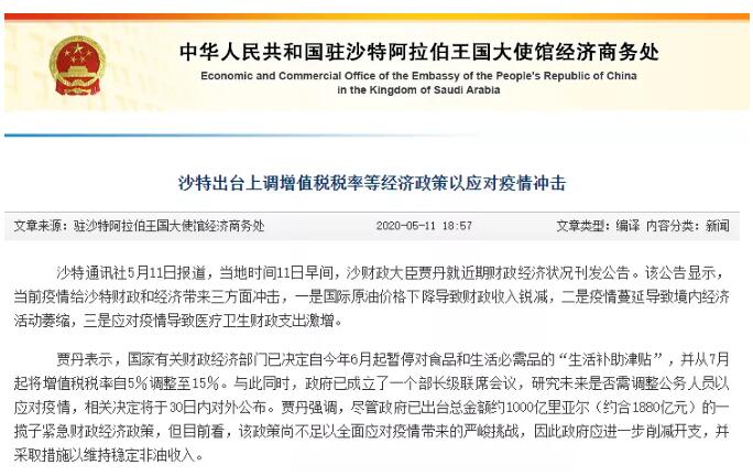 面對新冠疫情危機(jī)和其引發的全球性經濟衰退,大(dà)多數國(guó)家都(dōu)推出了擴張性财政刺激計(jì)劃,以提振國(guó)内經濟活動。沙特阿拉伯公布了一項計(jì)劃,将其增值稅增加三倍,從(cóng)7月1日(rì)開始,将增值稅(VAT)的稅率從(cóng)5%提高到15%,以增加額外财政收入。高貨值訂單(超過1000裡(lǐ)亞爾,約合266.4美金)在沙特阿拉伯清關時,将産生(shēng)進口增值稅和關稅,進口增值稅(VAT)稅金金額按照(zhào)買家實際支付金額x15%計(jì)算,關稅由海關根據不同商品的應稅稅率計(jì)算。沙特國(guó)家統計(jì)總局6月30日(rì)公布的統計(jì)數據顯示,沙特第一季度國(guó)民(mín)生(shēng)産總值較去(qù)年(nián)同期下降1%。數據顯示,一季度非石油行業的增長率爲1.6%,但(dàn)石油部門(mén)的增長率爲-4.6%。