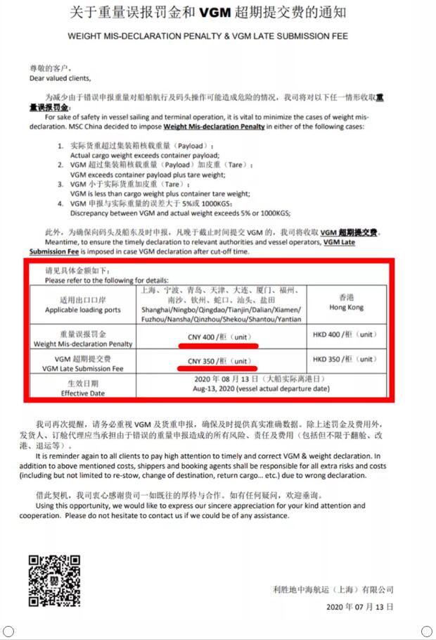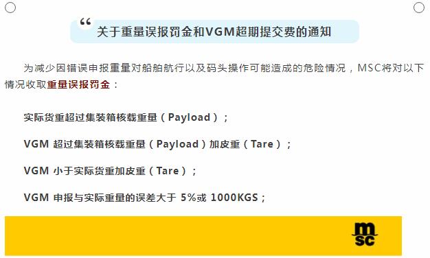 日(rì)前MSC發布通知,爲減少因錯誤申報重量對船(chuán)舶航行以及碼頭操作(zuò)可(kě)能造成的危險情況,将收取重量誤報罰金和VGM超期提交費!最高400元/櫃!