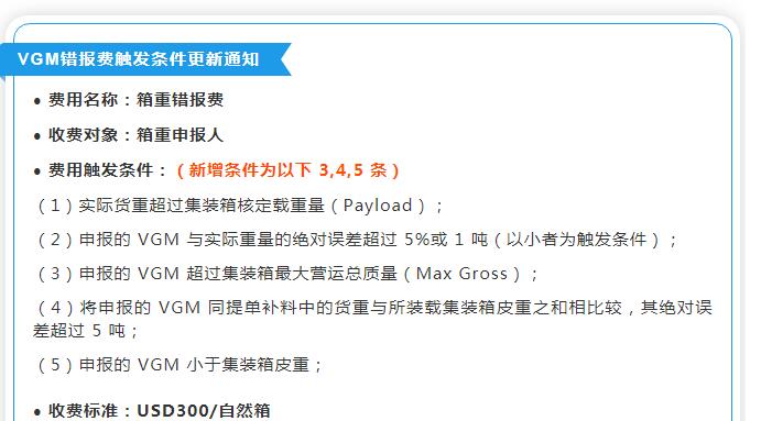 馬士基已發出通知,VGM錯報、瞞報将收取300美金/自(zì)然箱。該費用的觸發條件(jiàn)将于2020年(nián)7月1日(rì)(運費起算日(rì))進行如(rú)下更新: