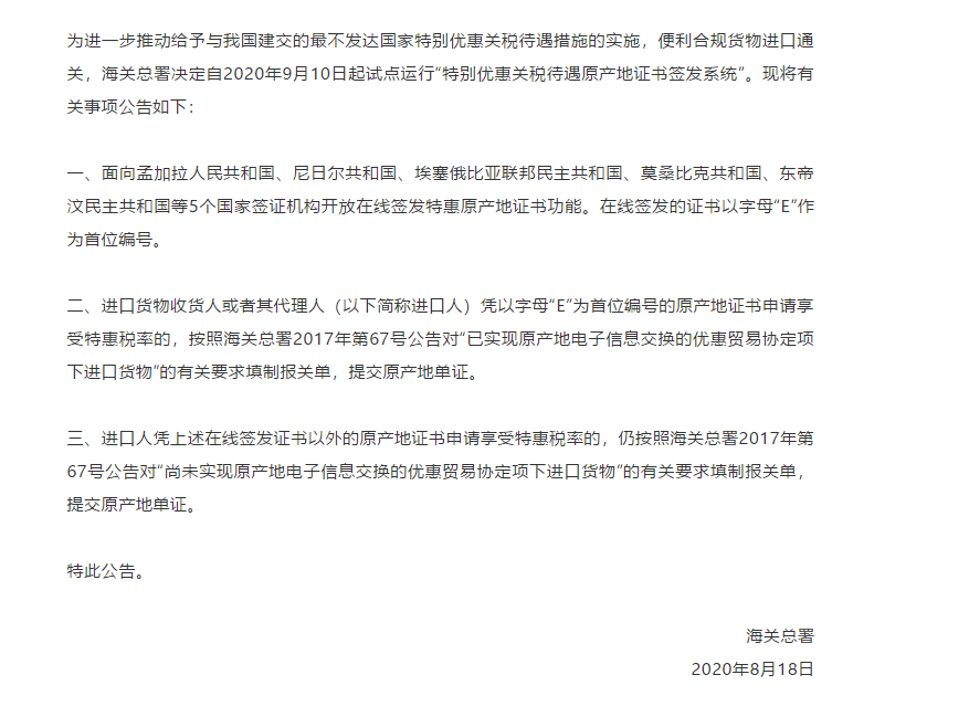 關于上線運行給予最不發達國(guó)家特别優惠關稅待遇原産地證書(shū)簽發系統有關事(shì)宜的公告