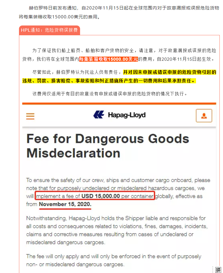 注意!船(chuán)公司:11月15日(rì)起,危險品誤報、瞞報罰款15000$每箱
