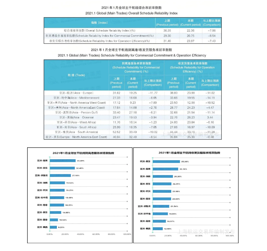 亞洲—歐洲航線到離(lí)港服務準班率居第4位,收發貨服務準班率居第6位,分(fēn)别爲19.25%和23.98%。受季風(fēng)惡劣天氣影(yǐng)響,部分(fēn)亞洲港口準班率脫班情況嚴重。在歐洲部分(fēn)國(guó)家罷工(gōng)影(yǐng)響下,英法海峽港口的混亂局面進一步惡化。亞洲—美西航線準班率情況不容樂觀,到離(lí)港和收發貨服務準班率均列倒數第1位,分(fēn)别爲9.23%和12.98%,降幅較2020年(nián)12月分(fēn)别減少7.89個和10.52個百分(fēn)點。洛杉矶港和長灘港有近700名碼頭工(gōng)人(rén)感染新冠病毒,港口方面擔心勞動力短(duǎn)缺或迫使碼頭關閉,港口擁堵情況還(hái)将持續。此外爲了緩解擁堵,洛杉矶港計(jì)劃出台獎勵新政,以提高運輸效率。