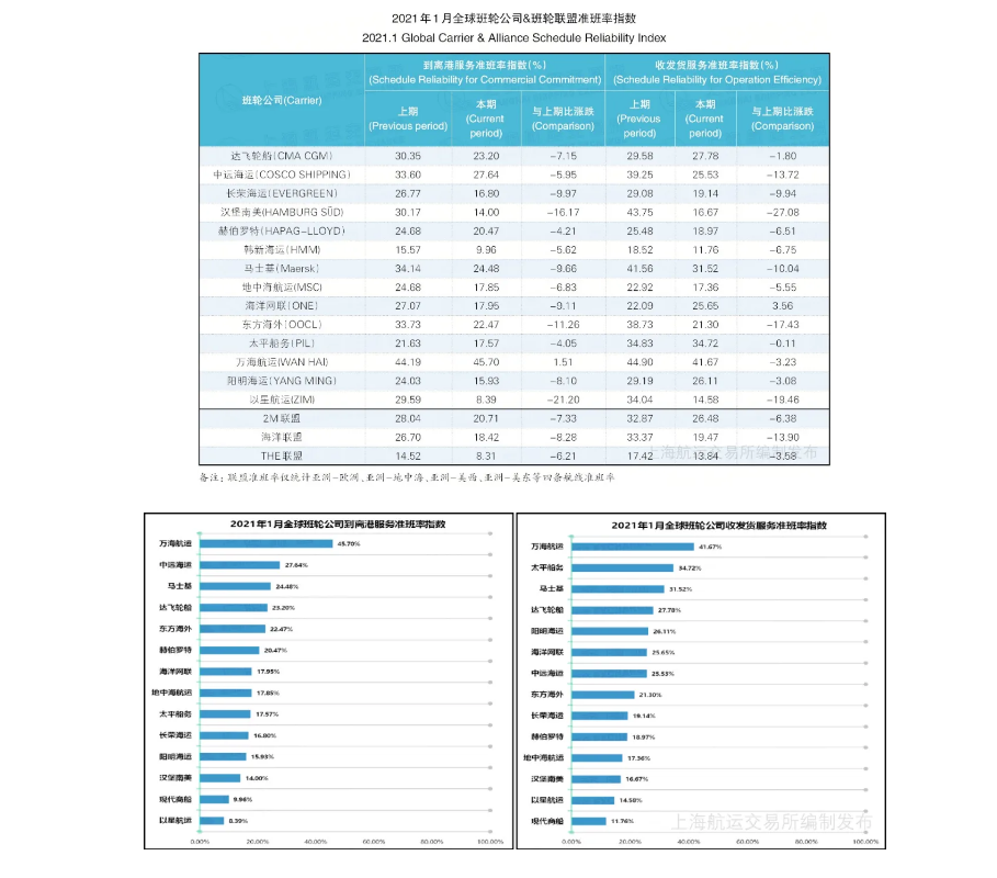 海洋聯盟到離(lí)港和收發貨服務準班率均居第2位,分(fēn)别爲18.42%和19.47%,降幅較2020年(nián)12月分(fēn)别減少8.28個和13.90個百分(fēn)點。