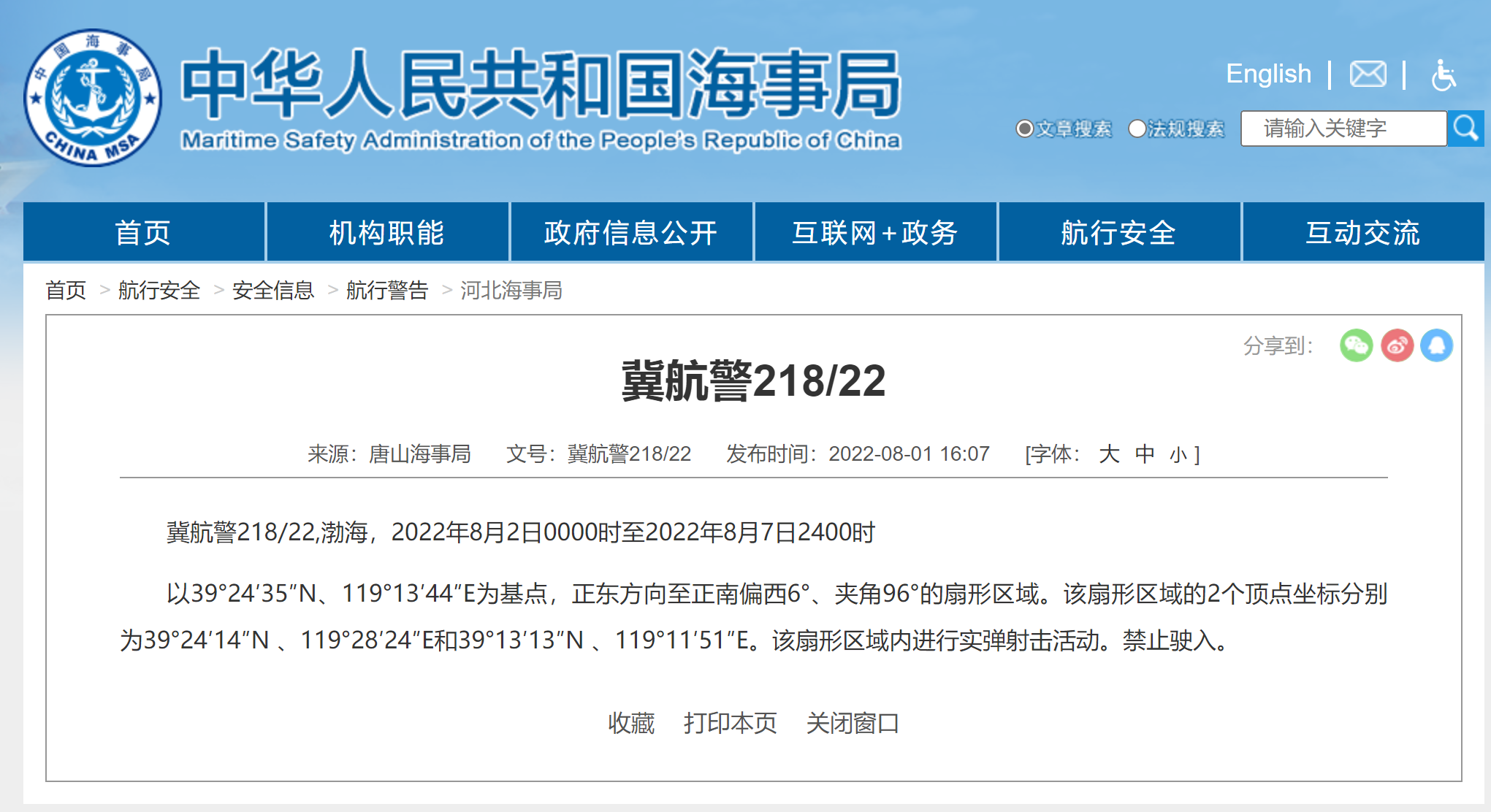 渤海北部,自(zì)8月1日(rì)1400時至8月4日(rì)2400時将在以39-50.80N 121-10.03E爲中心,8海裡(lǐ)爲半徑範圍内進行實彈射擊。禁止駛入。