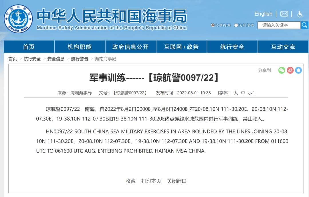 瓊航警0097/22,南(nán)海,自(zì)2022年(nián)8月2日(rì)0000時至8月6日(rì)2400時在20-08.10N 111-30.20E、20-08.10N 112-07.30E、19-38.10N 112-07.30E和19-38.10N 111-30.20E諸點連線水域範圍内進行軍事(shì)訓練,禁止駛入。