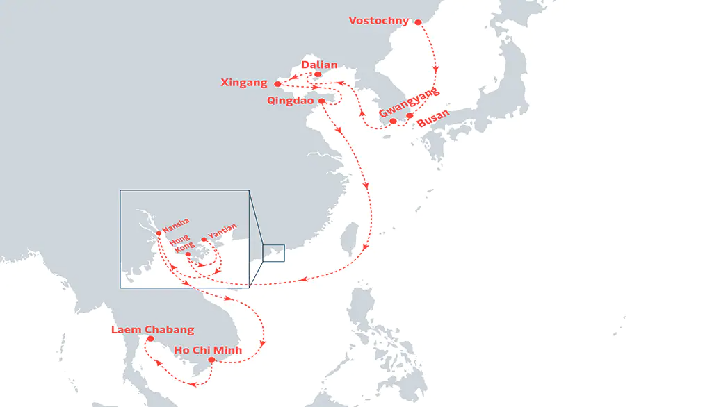 該輪曾于7月10-1日(rì)靠泊天津新港,7月19-20日(rì)靠泊上海港,7月22-23日(rì)靠泊廈門(mén)港,7月24-25日(rì)靠泊香港港,7月25-26日(rì)靠泊深圳蛇口港,然後駛往新加坡、科(kē)倫坡、那瓦希瓦、皮帕瓦沃港。涉及ANL、CMA CGM、CNC、COSCO SHIPPING、EVERGREEN、GOLD STAR LINE、HAMBURG SÜD、KAMBARA KISEN、OOCL、PIL、ZIM等船(chuán)公司共艙。