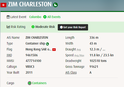 集裝箱船(chuán)“ZIM CHARLESTON”建造于2011年(nián),懸挂香港區旗,運力8586TEU,服務于以星亞洲内部的China India Express III (CI3)航線,事(shì)發時執行7W航次。7月份駛離(lí)中國(guó)前曾挂靠國(guó)内多個港口。