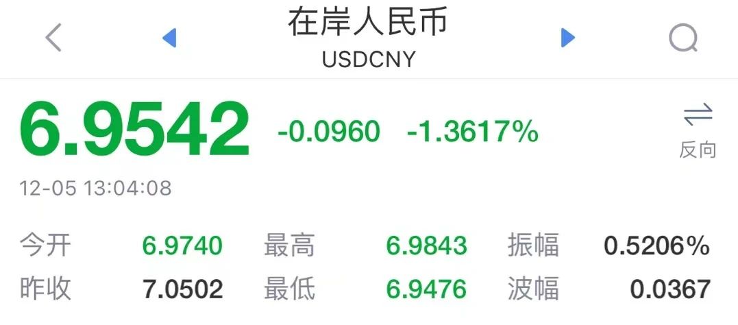 5日(rì),人(rén)民(mín)币彙率持續升值,離(lí)岸人(rén)民(mín)币對美元彙率日(rì)内上漲超600基點,率先漲回至7.0關口上方。截至發稿,離(lí)岸人(rén)民(mín)币對美元彙率報6.9511。