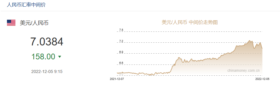 人(rén)民(mín)币兌美元彙率中間價也調升。外彙交易中心公布數據顯示,12月5日(rì),該中間價報7.0384元,較前一交易日(rì)調升158個基點。