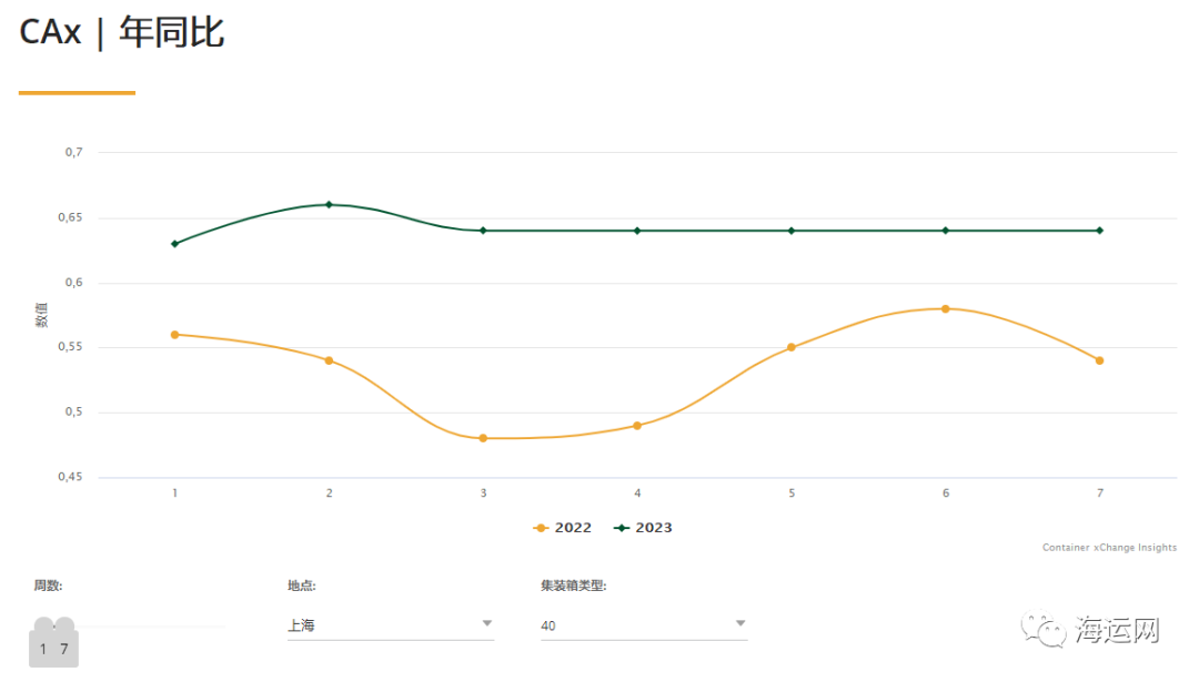 據全球集裝箱租賃和交易平台Container xChange最新數據顯示,上海20/40英尺集裝箱CAx的數值均高于去(qù)年(nián)同期,其中第二周達到0.66,之後幾周穩定在0.64,已經連續7周在0.6以上。作(zuò)爲對比,2022年(nián)第三周,上海40英尺集裝箱CAx的數值隻有0.48,最高時也僅爲0.59。CAx指數高于0.5,意味着入港集裝箱的數量大(dà)于離(lí)港集裝箱的數量,容易造成空箱在港口堆積的情況。