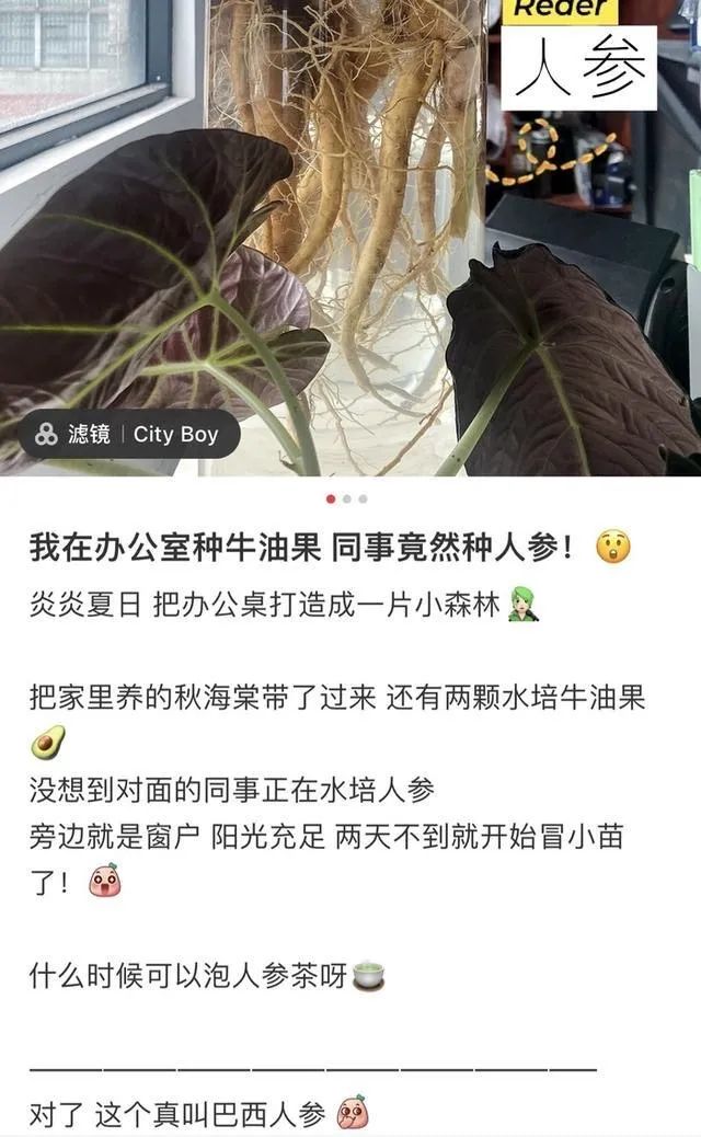有網友分(fēn)享了一組圖,“我在辦公室種牛油果,同事(shì)竟然種人(rén)參!”該網友表示,自(zì)己把家裡(lǐ)養的秋海棠和兩顆水培牛油果帶來(lái)辦公室,沒想到對面的同事(shì)“技高一籌”,正在水培人(rén)參。加上旁邊就(jiù)是窗(chuāng)戶,陽光(guāng)充足,兩天不到就(jiù)開始冒小苗了。網友們追問(wèn),“這到底是什麽人(rén)參品種”“什麽時候可(kě)以泡人(rén)參茶呀?”