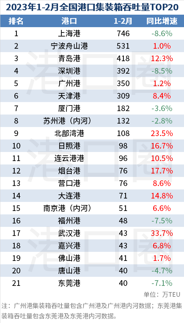 1-2月,全國(guó)港口集裝箱吞吐量前十名爲:上海港(第1)、甯波舟山(shān)港(第2)、青島港(第3)、深圳港(第4)、廣州港(第5)、天津港(第6)、廈門(mén)港(第7)、蘇州港(第8)、北部灣港(第9)、日(rì)照(zhào)港(第10)。