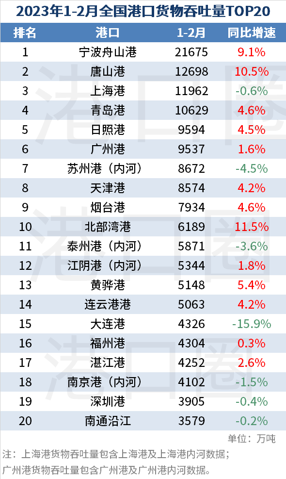 1-2月,全國(guó)港口貨物吞吐量前十名爲:甯波舟山(shān)港(第1)、唐山(shān)港(第2)、上海港(第3)、青島港(第4)、日(rì)照(zhào)港(第5)、廣州港(第6)、蘇州港(第7)、天津港(第8)、煙台港(第9)、北部灣港(第10)。
