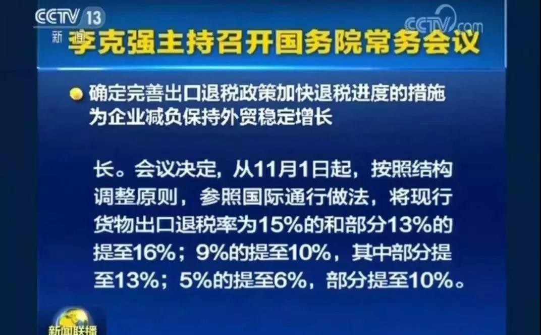 會議(yì)指出,實行出口退稅,符合世界貿易組織規則。進一步完善出口退稅政策,加快(kuài)出口退稅進度,有利于深化供給側結構性改革、推動實體(tǐ)經濟降成本,也有利于應對當前複雜國(guó)際形勢、保持外貿穩定增長。會議(yì)決定,從(cóng)2018年(nián)11月1日(rì)起,按照(zhào)結構調整原則,參照(zhào)國(guó)際通行做法,将現行貨物出口退稅率爲15%的和部分(fēn)13%的提至16%;9%的提至10%,其中部分(fēn)提至13%;5%的提至6%,部分(fēn)提至10%。對高耗能、高污染、資源性産品和面臨去(qù)産能任務等産品出口退稅率維持不變。