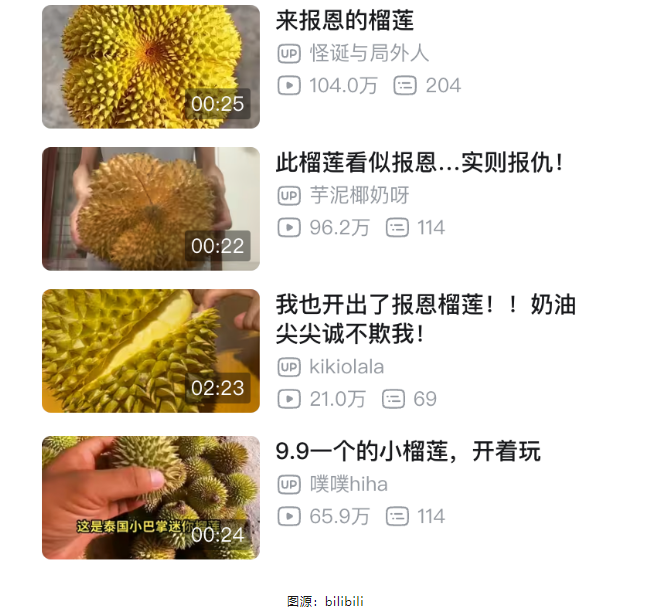 5月份,随着氣溫升高,榴蓮季來(lái)臨,一些社交媒體(tǐ)和短(duǎn)視頻平台中,“開榴蓮盲盒”相(xiàng)關的話(huà)題和浏覽量暴漲,開到5房(fáng)6房(fáng)肉的榴蓮被稱爲“報恩榴蓮”,開到皮厚肉小的則被戲稱爲“榴蓮糖”。這種幽默的調侃以及沉浸式的剝榴蓮解壓視頻出現跟風(fēng)現象,越來(lái)越多的用戶購(gòu)買榴蓮後,主動将開盲盒經曆上傳零售平台及社交媒體(tǐ),這在一定程度上刺激榴蓮銷量大(dà)增。