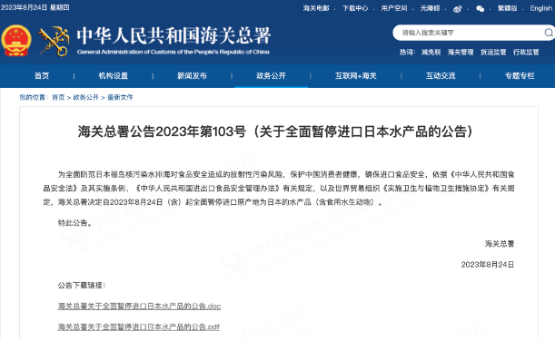 依據我國(guó)法律法規相(xiàng)關規定,以及世界貿易組織《實施衛生(shēng)與植物衛生(shēng)措施協定》相(xiàng)關規定,海關總署決定對原産地爲日(rì)本的水産品采取緊急措施,自(zì)2023年(nián)8月24日(rì)(含)起全面暫停進口原産地爲日(rì)本的水産品(含食用水生(shēng)動物)。