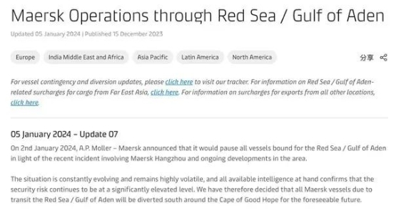 2023年(nián)12月30日(rì),“馬士基杭州”輪在從(cóng)新加坡到埃及蘇伊士港途經曼德海峽時遇襲,馬士基當時決定在未來(lái)48小時暫停經過該地區的航行。