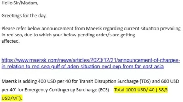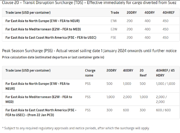 在1月5日(rì)的聲明中,馬士基還(hái)表示,此前宣布的紅(hóng)海/亞丁灣地區受幹擾船(chuán)舶上所有貨物的過境中斷附加費(TDS)、旺季附加費(PSS)和緊急應急附加費(ECS)仍然有效。